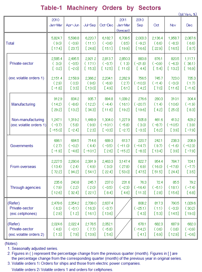 Machinery Orders in December, 2010 and Forecast for Jan.-Mar. 2011
