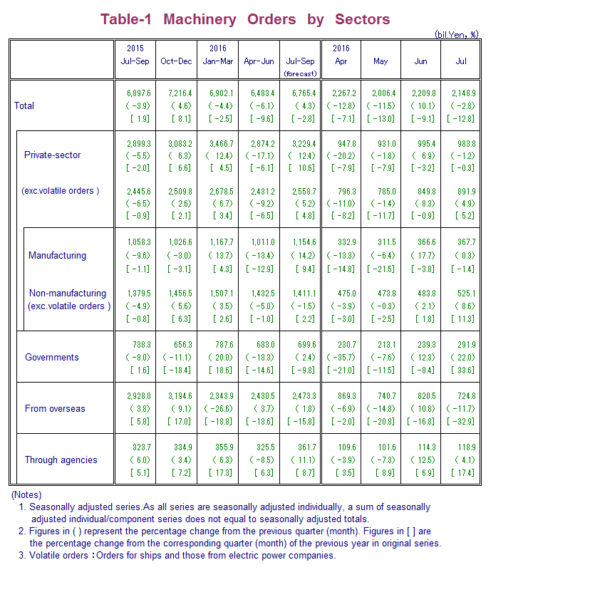 The total value of machinery orders received by 280 manufacturers operating in Japan decreased by 2.8% in July from the previous month on a seasonally adjusted basis.
