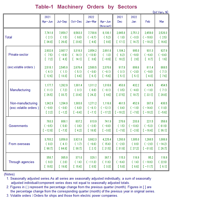 Machinery Orders in March, 2022 and Forecast for Apr.- Jun. 2022