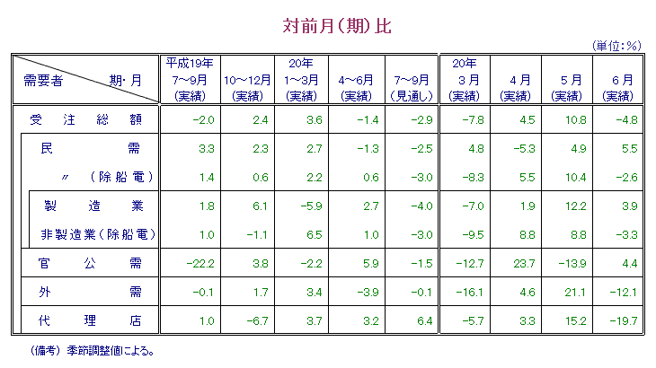 平成20年6月実績および平成20年7~9月見通し:機械受注統計調査報告