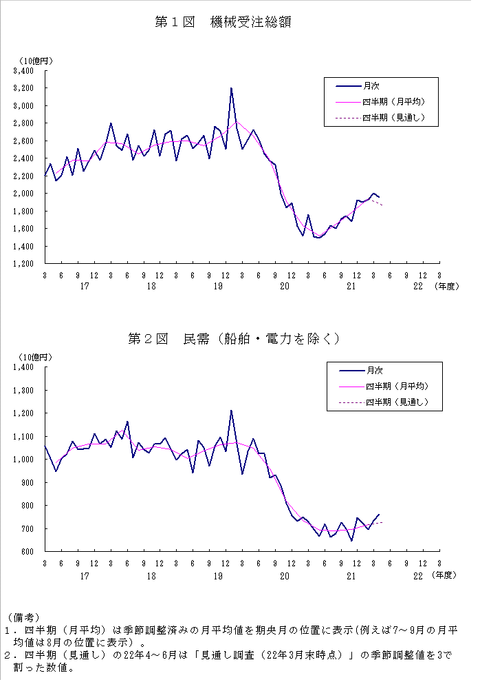 民間設備投資の先行指標である「船舶・電力を除く民需」の動向を見ると、 22年3月前月比5.4%増の後、4月は同4.0%増の7,619億円となった。 このうち、製造業は同5.5%減の2,963億円、非製造業(除く船舶・電力)は 同5.3%増の4,640億円となった。